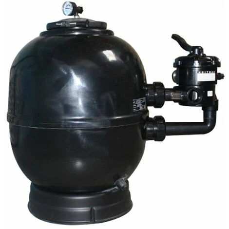 Filtre à sable Lamiperle Side Ø600. Corps en polyester et fibre de verre haute résistance. Vanne latérale 6 voies incluse. Débit 14m³/h. – – – –