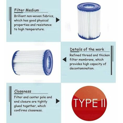 Taille : ce filtre est spcialement conu pour Bestway Type II. Dimensions du filtre de piscine : environ Diamtre extrieur : 106 mm – Diamtre intrieur : 52 mm – Hauteur : 136 mm – Veuillez confirmer votre modle de pompe avant l’achat. .