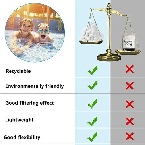 【Matériau Respectueux de l’Environnement】- Les boules de filtre de piscine sont constituées de polyéthylène 100% recyclable, qui est léger, non toxique, matériau respectueux de l’envromental à haute perméabilité et une forte capacité d’adsorption. 1400g équivaut à 50 kg de sable filtrant.