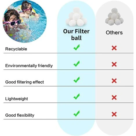 Fabriqué en polyéthylène 100 % recyclable. Capacité d’adsorption élevée, améliorant efficacement la qualité de l’eau. La boule filtrante peut capturer des particules plus petites que le sable filtrant ordinaire. Applicable à presque tous les systèmes de filtre à sable. Un paquet (0,7 kg) peut remplacer environ 25 kg de sable filtrant. Une nouvelle génération de matériaux filtrants.