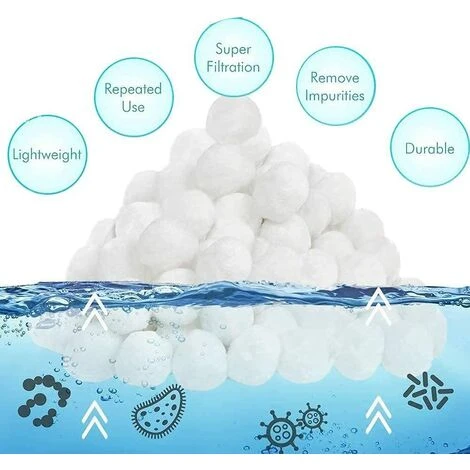 [Boule filtrante très polyvalente] Un seul filtre de 50 cm de diamètre ; poids total : 700 g peut remplacer 25 kg de sable filtrant. La boule filtrante est généralement applicable à la plupart des nettoyeurs de piscine à chaudière filtrante. Il convient également aux pompes de filtration de saumure à sable.[Matériau de la boule filtrante] : la boule filtrante de la piscine est composée à 100 % de polyéthylène, qui est recyclable, flexible, non toxique et stable. Poids : 700 grammes, pouvant remplacer 25 kilogrammes de sable filtrant.[Super durable, recyclable]: Absorption élevée de la poussière, perméabilité à l’eau élevée, filtration plus légère et plus efficace, respectueux de l’environnement et recyclable. Longue durée de vie et économie d’énergie. Il présente les avantages d’une résistance élevée à la filtration, d’une vitesse de filtration rapide, d’une longue durée de vie, d’une bonne flexibilité lors d’une utilisation répétée et d’une faible perte.[Boule filtrante simple et efficace] Coulée sur la machine, elle convient également à votre système de filtre à sable. La boule filtrante est facile à utiliser et peut être utilisée dans n’importe quel système de filtre à sable courant pour obtenir facilement un excellent effet de filtre.[Une large gamme de boules filtrantes réutilisables pour piscine] : nos boules filtrantes sont généralement applicables à presque tous les nettoyeurs de piscine dans la piscine filtrante. Il convient également aux pompes de filtration de saumure à sable. Largement utilisé dans les piscines, les aquariums, les pompes filtrantes, le sable filtrant et d’autres médias.