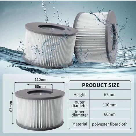 - ?Cartouches filtrantes pour bains à remous pour Mspa? Dimensions : Ø 11 cm x 6.7 cm. Convient pour les bains à remous Cartouches filtrantes pour bains à remous pour mspa, filtrage automatique de l’eau des impuretés. Avec 90 lamelles et une superficie de 4 000 centimètres carrés, le filtre est l’un des systèmes de filtration les plus efficaces pour les bains à remous gonflables.