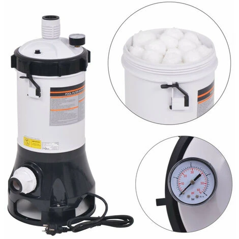Pompe de filtration :Couleur : blanc et noirMatériau : ABS et polyéthylène (PE)Dimensions : 30,6 x 66 cm (Diamètre x H)Alimentation : 230 V ~, 50 HzPuissance : 185 W (0,25 ch)Débit : 4,4 m³ / hDiamètre du port de raccordement : 2 poPression de service maximale : 3,45 bar (50 PSI)Indice de protection : IPX4Réservoir résistant à la corrosionConvient aux piscines Intex et BestwayBilles filtrantes :Quantité : 100 pcsPoids : 550 gLa pompe de filtration a un débit de 4,4 m³ / h. Elle a un réservoir durable et résistant à la corrosion. Les billes filtrations en coton incluses filtreront efficacement même les plus petites particules. Elles sont légères et plus faciles à gérer que d’autres milieux de filtration comme le sable. L’efficacité des billes filtrantes de 550 g est équivalente à celle de 20 kg de sable filtrant. Les billes filtrantes nécessitent également une pression de travail plus faible, ce qui réduit la consommation d’énergie.Nous ne livrons pas en Corse.