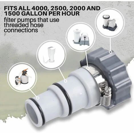 Compatible avec toutes les pompes de filtration Intex 15141.65, 9463.53, 7570.82 et 5678.12 l/h utilisant des raccords de tuyaux filetés.