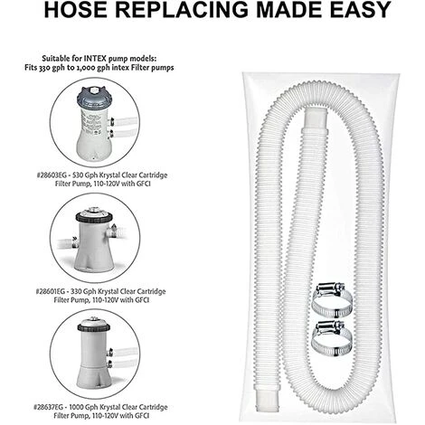 Les tuyaux de rechange conviennent aux pompes à filtre Intex 607 et 637. Les tuyaux de pompe de piscine universels sont disponibles pour les pompes de filtration Intex de 330 GPH à 1000 GPH, pour une utilisation dans les piscines hors sol et les côtés souples de toutes les piscines. Convient aux modèles de pompe Intex 330 GPH, 530 GPH et 1000 GPH. Convient pour les piscines hors sol, les bains à remous, les bains à remous, etc.