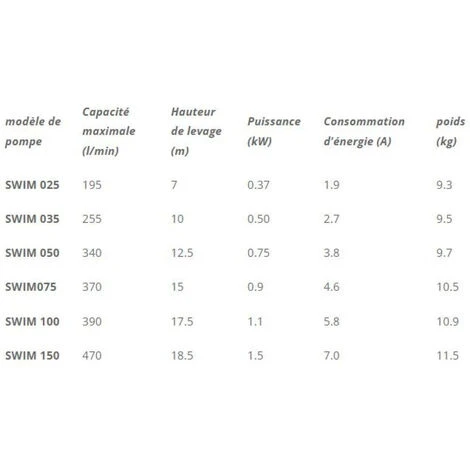 | modèle de pompe | CapacitĂ© maximale (l/min) | Hauteur de levage (m) | Puissance (kW) | Consommation d’Ă©nergie (A) | poids (kg) |
