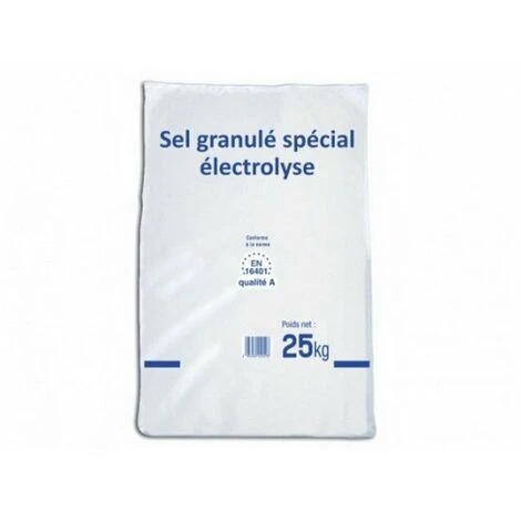 Sel granulé spécial électrolyse conforme à la norme européenne EN16401. Sac de 25 kg. Pour la désinfection des eaux de piscine par électrolyse du chlorure de sodium.
