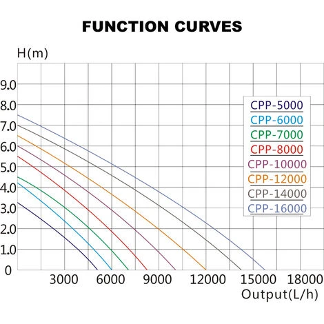 • SunSun CPP-8000F: puissance: 62 W, hauteur de refoulement: 6,0 m, débit: 5000 l/h (avec un tuyau de 1.2 m x ø32 mm )